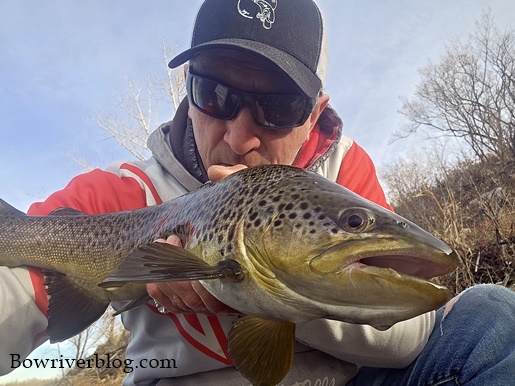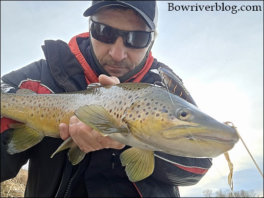 Charlene fired her first cast out into the frigid flow of the river, and in short order, she was into her first New year Brown trout. The fish were actively eating at 10Am, as it stayed warm overnight due to the chinook earlier in the week. It was not long after her first fish that I latched into another great Bow River brown trout. In total we landed twelve browns and one rainbow. We decided to pack it in at 2PM and get some errands done.